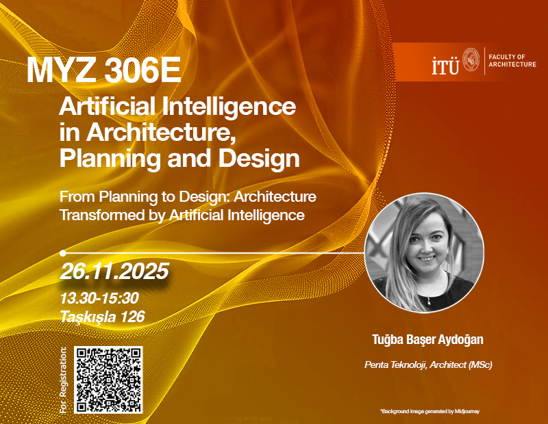 İTÜ Mimarlık Fakültesi bünyesinde 2025-2026 Güz yarıyılında yürütülen ‘MYZ 306E Artificial Intelligence in Architecture, Planning and Design‘ dersinin beşinci semineri 26.11.2025 tarihinde Penta Teknoloji Teknik Satış Grup Yöneticisi Y. Mimar Tuğba Başer Aydoğan tarafından verilecektir.